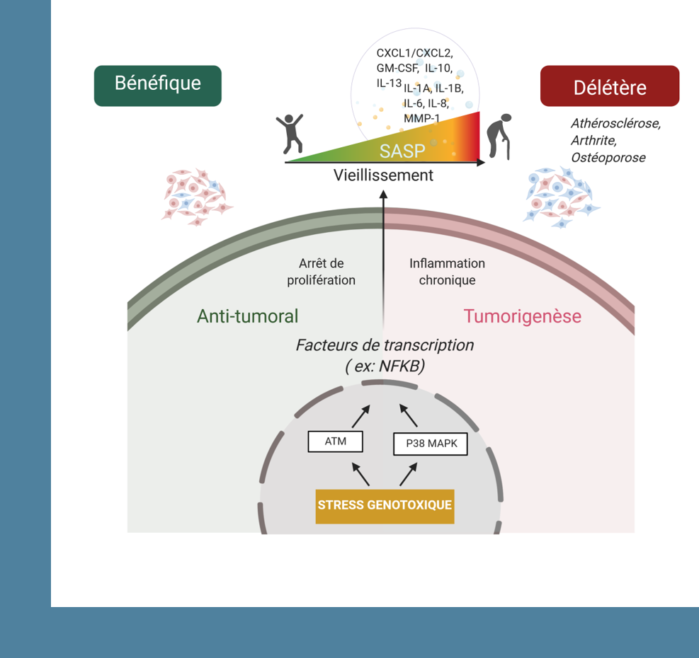 Le vieillissement est associé à une accumulation de cellules sénescentes produisant un environnement cellulaire inflammatoire qui pourrait expliquer différentes maladies liées à l’âge. Diverses situations menant à la sénescence sont liées à la présence de dommages de l’ADN. De plus, de nombreux syndromes progéroïdes sont associés à une instabilité du génome ou de la structure nucléaire. Nous discuterons du lien étroit existant entre l’altération des lamines, composants de l’enveloppe nucléaire, et le vieillissement cellulaire. Nous verrons que l’altération de l’enveloppe nucléaire, comme celle observée dans la Progéria, est aussi associée à des défauts de réparation de l’ADN, à une persistance de dommages de l’ADN et à un phénotype inflammatoire.